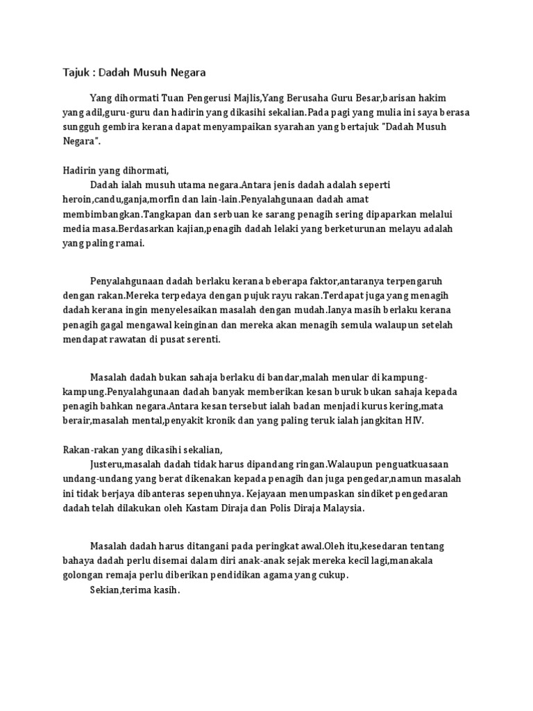 KARANGAN BAHAYA DADAH Penyalahgunaan dadah bukan perkara baru di dunia ini. Yang saya Muliakan Tuan Pengerusi MajlisYang Berusaha Puan Syuhada Binti IsmailPengetua Sekolah Menengah Kebangsaan Taman MerahYang Dihormati Puan Rohani Binti AbdullahGuru Penolong KananPuan Aisyah Binti GhaniGuru Penolong Kanan Hal Ehwal Muridbarisan panel hakim yang sentiasa berteraskan. AF Sebelum saya memulakan syarahan pada pagi ini izinkan saya untuk menerangkan maksud dadah.